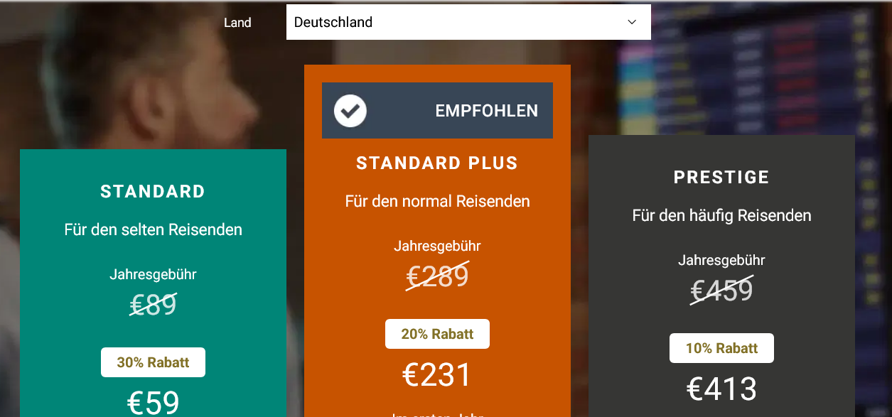 - STANDARD: Empfohlen für „Wenigreisende„, mit dieser Mitgliedsstufe habt ihr das „Recht“ für 30 Euro einen Loungezugang vor Abflug oder während eines Transitaufenthalts zu erwerben. Gäste können gegen eine Gebühr in Höhe von 30 Euro ebenfalls mitgenommen werden. Preis pro Jahr: 89 €