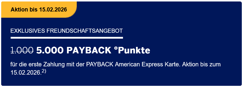 Bis zum 15. Februar 2026 erhaltet ihr bei der Beantragung über die Freundschaftswerbung 5000 Payback Willkommenspunkte. Alles was ihr dafür tun musst ist Eure neue American Express Payback Kreditkarte erstmalig einzusetzen.