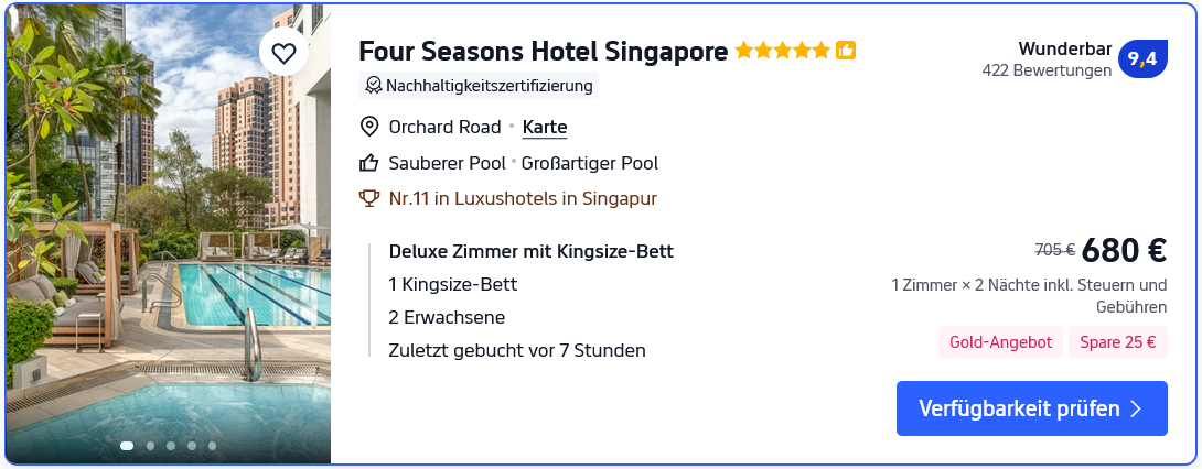 Für die Buchung von Hotels in Singapur empfehlen wir die Buchung über die Online Travel Agents Agoda, Trip com oder Booking com. Neben Agoda bietet Trip com die größte Auswahl an Hotels in Singapur, der Kundenservice bei beiden Travel Agents ist sehr gut. Booking com hingegen bietet auch kleinere Hotels und Resorts an.