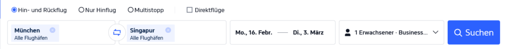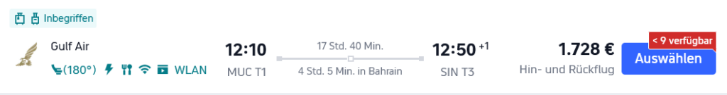 Toller Business Class DEAL von Gulf Air von Deutschland nach Singapur. In deren Business Class gibt es an vielen verfügbaren Daten super günstige Preise für um die 1.700 €, so ist der Hin- und Rückflug von München nach Singapur im Frühjahr bei Trip com aktuell bereits für 1.738 € buchbar.